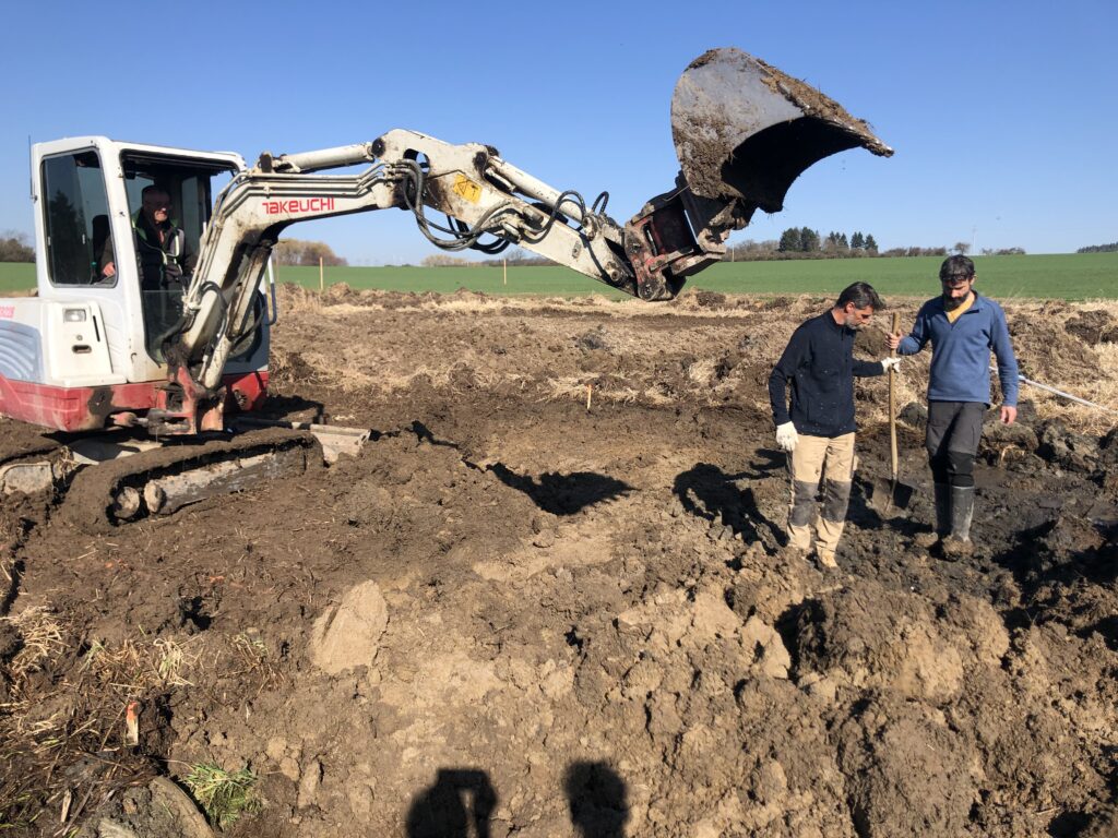 Hloubení tůni zajišťovala místní firma, která sídlí přes pole. Při bagrování jsme narazili v zemi na staré polofunkční meliorace a další prameny, které budou tůně plnit. Trvalo nám to tři dny a zasadili jsme olši a střemchu, kterým se bude dařit v podmáčené půdě a mokřad tak bude plnit funkci polního remízku.